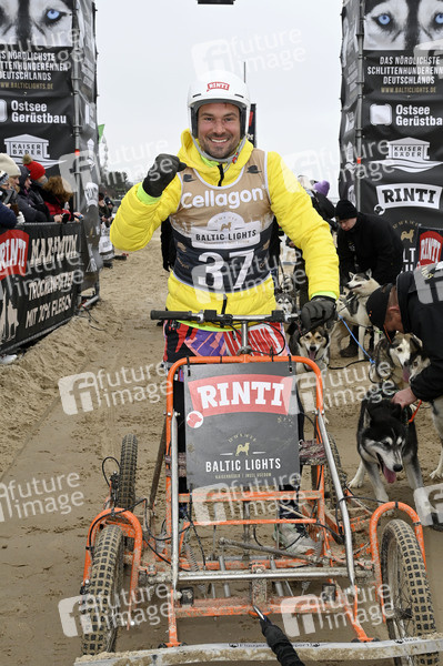 Robert Redweik beim 9. Baltic Lights 2025 Charity-Schlittenhunderennen zu Gunsten der Welthungerhilfe zwischen der Seebrücke Ahlbeck und der Seebrücke Heringsdorf. Heringsdorf, 01.03.2025