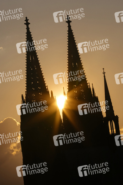Die untergehende Sonne scheint zwischen den beiden Türmen des Kölner Dom hindurch. Köln, 30.05.2019