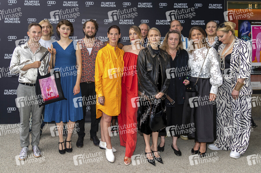 Florian Appelius, Campbell Caspary, Johanna Polley, Bastian Reiber, Bibiana Beglau, Sina Martens, Mathias Max Herrmann, Mavie Hörbiger, Irene von Alberti, Godehard Giese, Britta Hammelstein, Timo Jacobs und Monika Anna Wojtyllo bei der Premiere des Kinofilms 'Die geschützen Männer' im Filmtheater am Sendlinger Tor, München, 01.07.2024