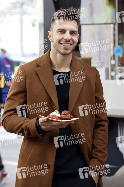 Tim Stammberger bei der Eröffnung von 'Willi Herren's Rievkooche Bud'. Willi Herren stellt seinen Reibekuchen-Truck am Gelände der Selgros vor. Köln, 16.04.2021