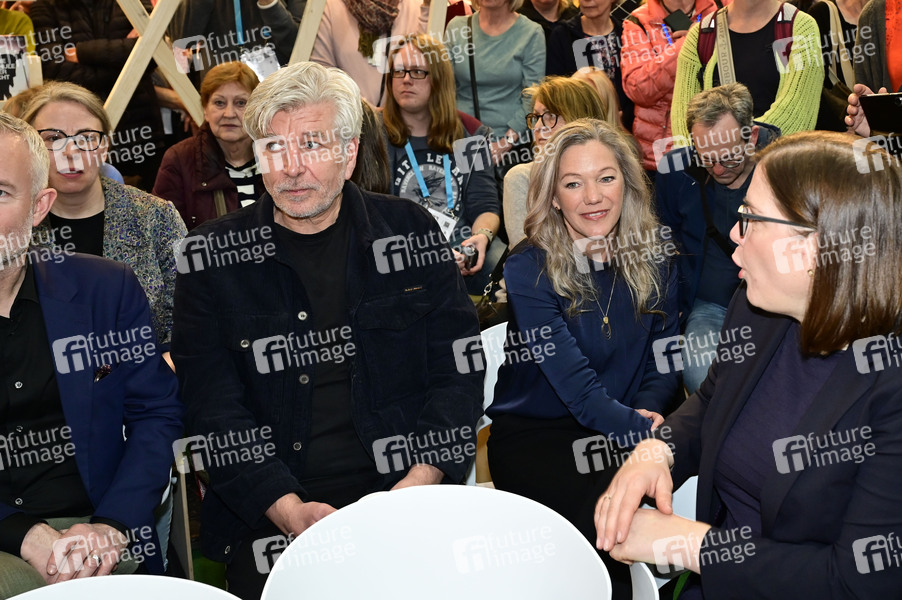 Karl Ove Knausgard und Maja Lunde bei der Eröffnung des norwegischen Gastlandstandes in Halle 4 auf der Leipziger Buchmesse 2025 auf dem Messegelände. Leipzig, 27.03.2025