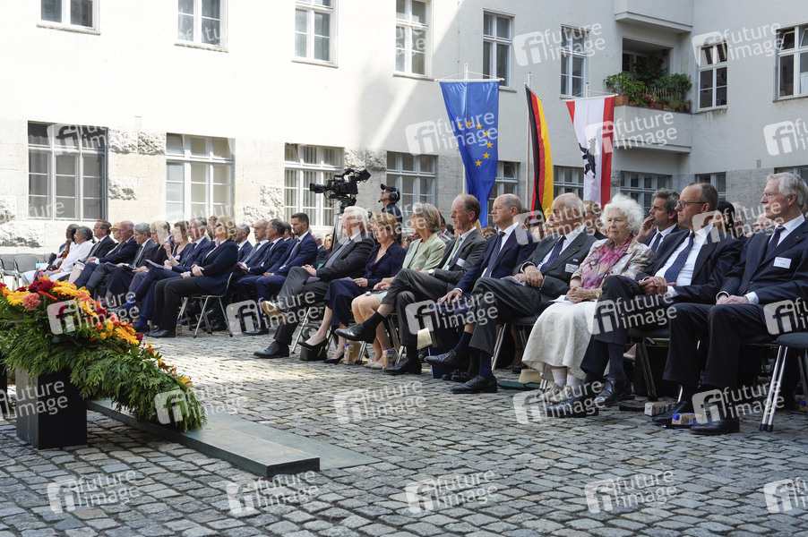 Frank-Walter Steinmeier, Elke Büdenbender, Valerie Riedesel Freifrau zu Eisenbach, Philipp Riedesel Freiherr zu Eisenbach, Olaf Scholz, Berthold Maria Schenk Graf von Stauffenberg, Mechthild Schenk Gräfin von Stauffenberg, Friedrich Merz und Axel Smend bei der Gedenkveranstaltung zum 80. Jahrestag des Aufstands gegen Nationalsozialistische Gewaltherrschaft mit Kranzniederlegung auf dem Ehrenhof des Bendlerblocks.Berlin, 20.07.2024
