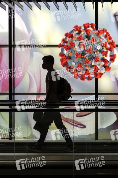 Notwendige Reisen in Zeiten von Corona. Bildmontage mit Reisenden in Flughafen Amsterdam Schiphol und einer 3D Illustration des Coronavirus vom CDC
