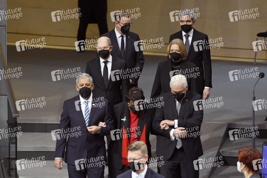 Mickey Levy, Inge Auerbacher, Olaf Scholz, Bodo Ramelow, Bärbel Bas, Frank-Walter Steinmeier und Stephan Harbarth bei der Gedenkstunde zum Tag des Gedenkens an die Opfer des Nationalsozialismus anlässlich des Jahrestages der Befreiung des NS-Vernichtungslagers Auschwitz im Deutschen Bundestag im Reichstagsgebäude. Berlin, 27.01.2022