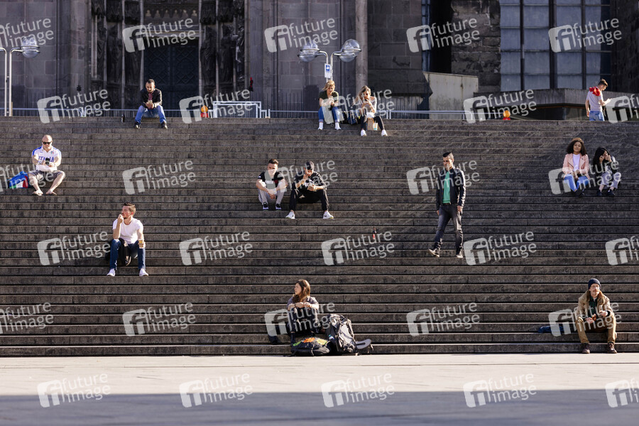 Kölner halten während der Ausgangsbeschränkungen in der Coronakrise den Mindestabstand ein und genießen die Sonne an der Domtreppe. Köln, 07.04.2020