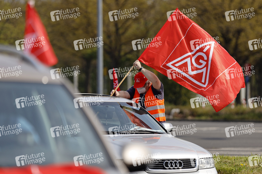 Fahnen der IG Metall bei der Kundgebung des NRW DGB zum Ersten Mai im Autokino an der Merkur Arena. Düsseldorf, 01.05.2021