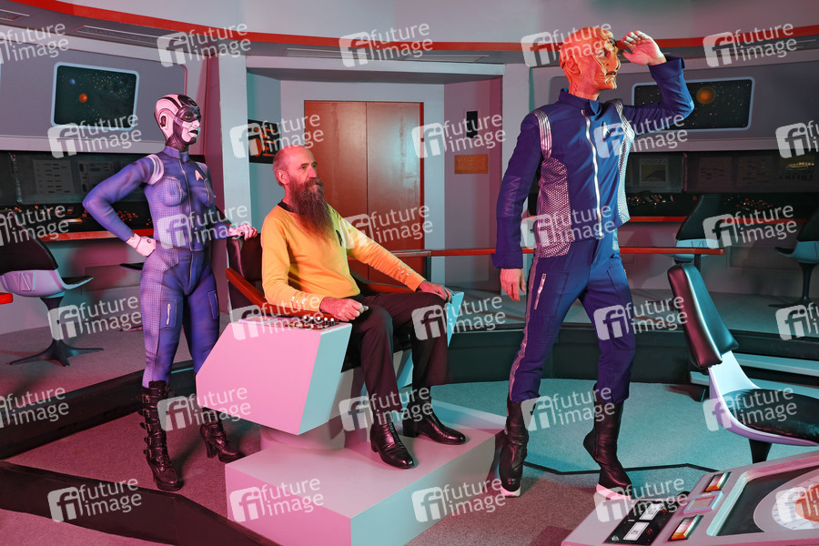 GEEK ART - Bodypainting meets SciFi, Fantasy and more: 'Star Trek Discovery' Photoshooting mit Model Barbara Wegener als Airiam, Enrico Lein als Saru und Martin Netter als Captain auf der Brücke vom Raumschiff Enterprise im Filmwelt Center. Bad Münder, 18.04.2019 - Ein Projekt des Fotografen Tschiponnique Skupin und des Bodypainters und Transformakers Enrico Lein