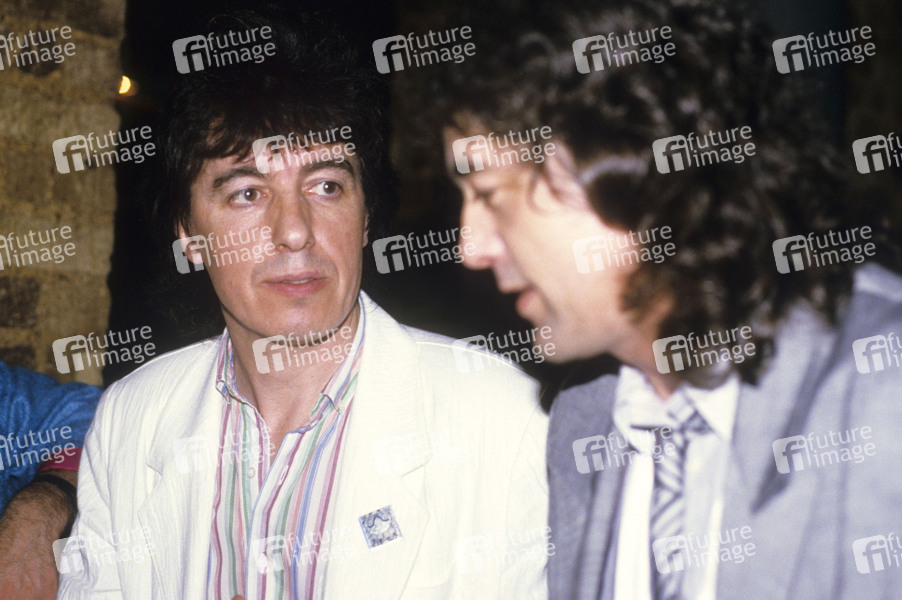 Bill Wyman und Jimmy Page von Willie and the Poor Boys bei einem Pressetermin. London, 18.04.1985