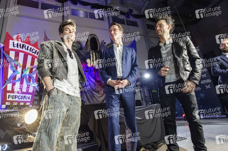 Chris Ehrlich, Hendrik Wüst und Andreas Ehrlich beim Besuch des NRW-Ministerpräsidenten am Firmensitz der Ehrlich Entertainment GmbH & Co. KG mit dem international erfolgreichen Künstler-Duo Ehrlich Brothers. NRW-Ministerpräsident Hendrik Wüst nimmt eine Reihe von Terminen in Ostwestfalen-Lippe wahr. In Gesprächen und Begegnungen vor Ort will er sich einen Eindruck von aktuellen Projekten und Herausforderungen in der Region verschaffen. Dabei stehen Impulse aus Wissenschaft und Forschung, Einblicke in innovative Praxis und Unternehmenskultur sowie Begegnungen mit kreativen Persönlichkeiten im Mittelpunkt. Bünde, 26.02.2026