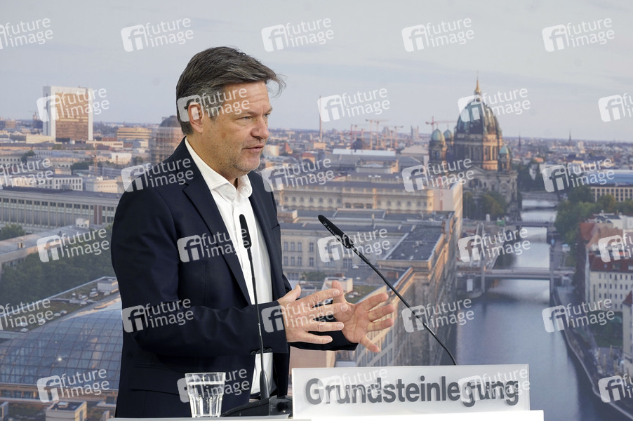 Robert Habeck bei der Grundsteinlegung einer Abwassergroßwärmepumpe von Vattenfall und Befüllen einer Zeitkapsel auf dem Kraftwerksgelände Reuter-West. Berlin, 12.03.2024