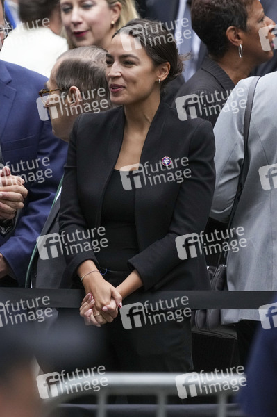 Alexandria Ocasio-Cortez bei der Gedenkfeier für die Opfer der Terroranschläge vor 21 Jahren am 9/11 Memorial. Mit Schweigeminuten und der Verlesung der Namen der fast 3000 Todesopfer haben die USA am Sonntag an die Terroranschläge vom 11. September 2001 erinnert. Am früheren Standort des World Trade Centers in New York verlasen Angehörige wie jedes Jahr am 11. September die Namen aller Anschlagsopfer. New York, 11.09.2022