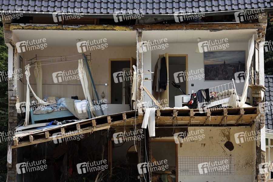 Nach dem Jahrhunderthochwasser in der Eifel durch heftige Regenfälle und Dauerregen mit Überschwemmungen und Überflutungen haben die Aufräumarbeiten im Ahrtal begonnen. Einheiten von Polizei, THW, Bundeswehr und Feuerwehr mitsamt vielen freiwilligen Helfern räumen Straßen, entfernen Schutt und Schlamm und versorgen die Menschen. Im Bild zerstörte Häuser an der Uferpromenade in der Ortschaft Dernau, in der die Flut viele Häuser zerstörte, 22.07.2021