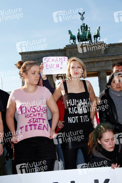 Flüchtlinge und Aktivisten, die vor dem Brandenburger Tor für eine neue Asylpolitik demonstrieren, werden von Politkerinnen der Piratenpartei unterstützt, Berlin