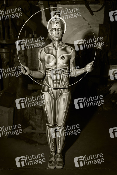 Farbkörper, Cosplay, Cosplayer, Make-up, Latexappliaktionen, Latexteile, Maskenbildnerei, Bodypainting, Body-Painting, Erotik, Frau, Mädchen, nackt, Akt, weiblich, Körperkunst, Körperfarben, Farbe, Bemalung, Kunst, Malerei, Science Fiction, Sci-Fi, SciFi, Fantastic, Roboter, Mensch-Maschine, Android, Werkstatt, Handwerk, Retro, retrofuturistisch, body painting, erotic, woman, girl, nude, female, body art, colors, robot, workshop, craft, retrofuturistic