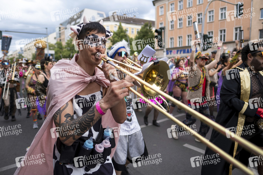 Die Parade zum 27. Karneval der Kulturen zieht durch Berlin-Friedrichshain. Etwa 4000 Tänzer in etwa 70 verschiedenen Gruppen und Umzugswagen nehmen an der Parade teil. Berlin, 08.06.2025