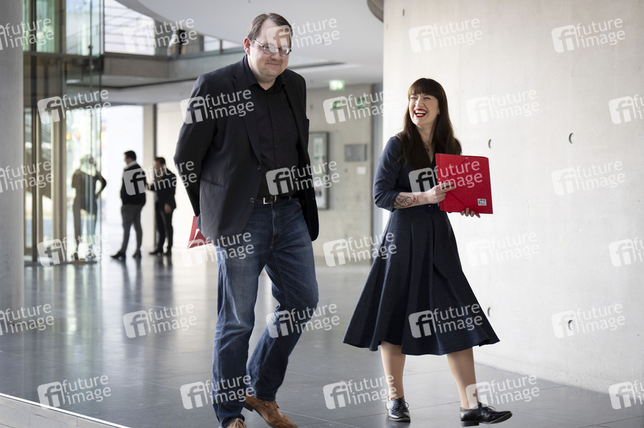 Sören Pellmann und Heidi Reichinnek bei einem Pressestatement der Partei Die Linke im Reichstagsgebäude. Berlin, 10.03.2025