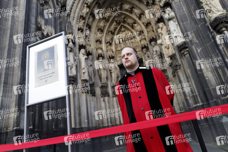 Ein Domschweizer vor dem Eingang des Kölner Dom, in dem das Erzbistum Köln wegen der Corona-Krise alle Gottesdienste einstellt. Köln, 20.03.2020