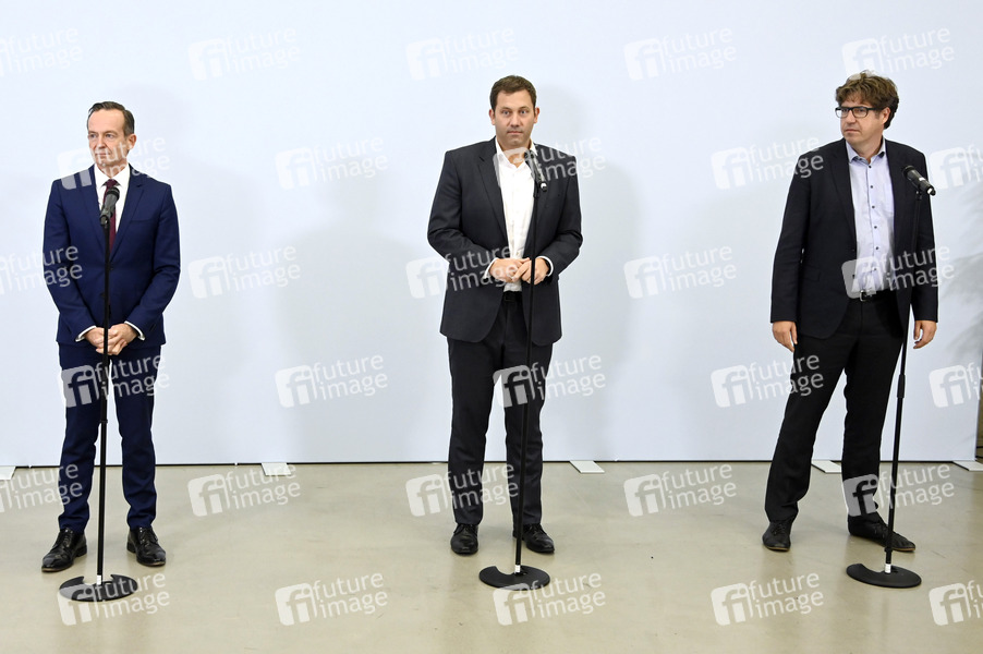 Volker Wissing, Lars Klingbeil und Michael Kellner beim gemeinsamen Statement zum Gespräch zwischen SPD, Bündnis 90/Die Grünen und FDP im CityCube Berlin. Berlin, 07.10.2021