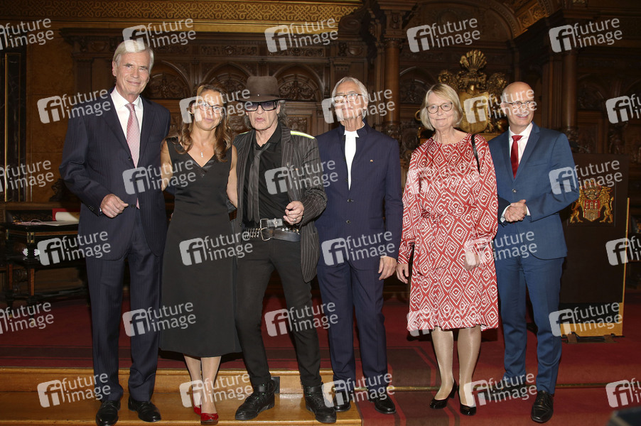 Michael Otto, Carola Veit, Udo Lindenberg, John Neumeier, Kirsten Boie und Peter Tschentscher beim Festakt zur Verleihung der Ehrenbürgerwürde an Udo Lindenberg im Großen Festsaal im Rathaus. Hamburg. 07.09.2022