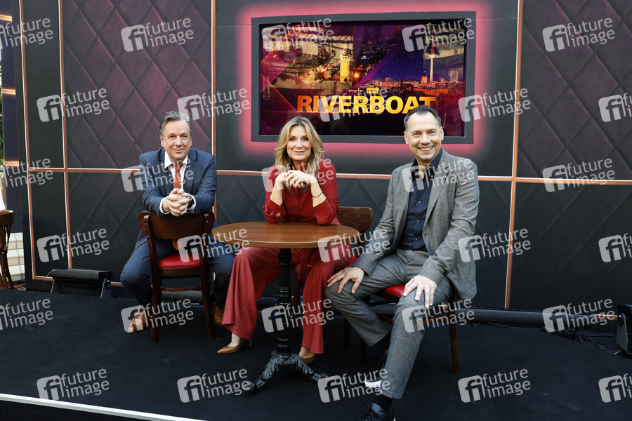 Jörg Kachelmann, Kim Fisher und Sebastian Fitzek beim Pressetermin zur MDR/rbb-Talkshow 'Riverboat' in der Riverboat-Kulisse im Mediengarten der Media City Leipzig. Leipzig, 08.10.2021