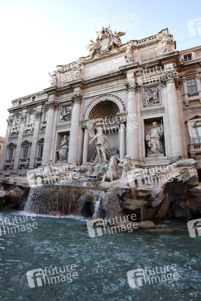 größter Brunnen Roms und einer der bekanntesten Brunnen der Welt, 26 Meter hoch, 50 Meter breit, eingeweiht 1735, besteht aus einer Palastfassade mit Triumphbogen, davor tummeln sich Meeresgestalten auf einer Felslandschaft, Fabelwesen des Meeres, Meerespferde, Tritonen, im Zentrum der herrschaftliche Meeresgott Oceanus