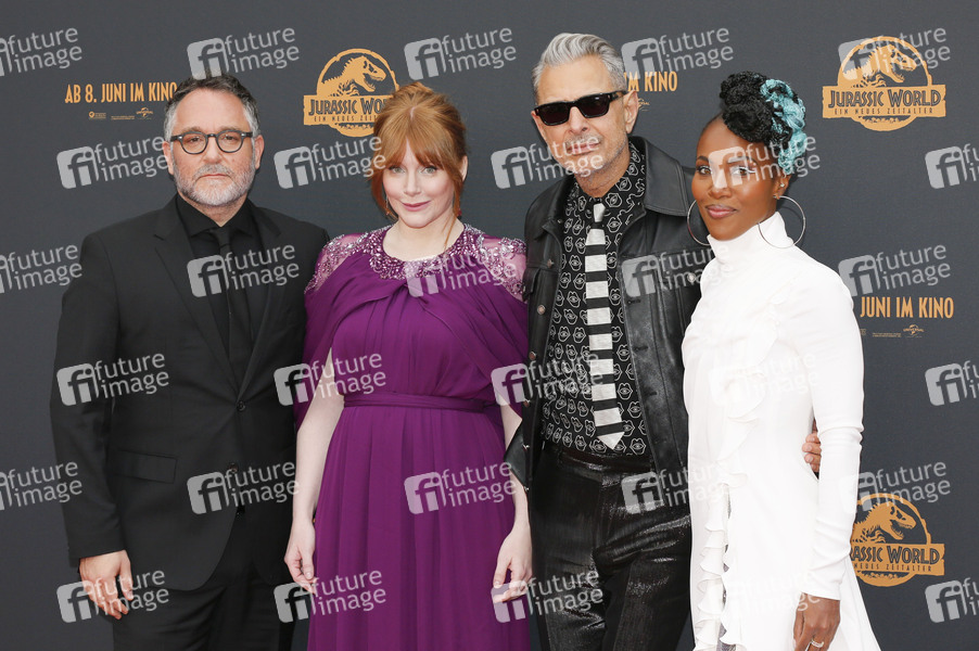 Colin Trevorrow, Bryce Dallas Howard, Jeff Goldblum und DeWanda Wise bei der Premiere des Kinofilms 'Jurassic World: Ein neues Zeitalter / Jurassic World Dominion' im Cinedom. Köln, 30.05.2022