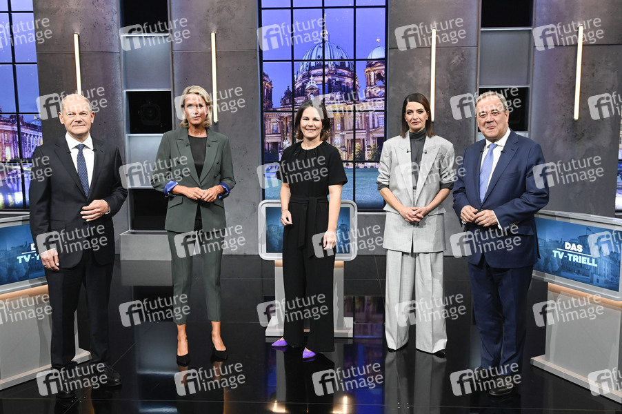 Olaf Scholz, Claudia von Brauchitsch, Annalena Baerbock, Linda Zervakis und Armin Laschet beim 'Triell - Dreikampf ums Kanzleramt' von ProSieben, SAT.1 und Kabel Eins mit den Kanzlerkandidaten im Studio Berlin-Adlershof. Berlin, 19.09.2021