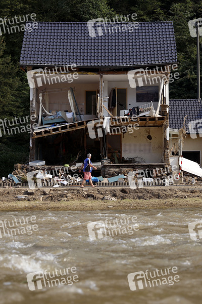 Nach dem Jahrhunderthochwasser in der Eifel durch heftige Regenfälle und Dauerregen mit Überschwemmungen und Überflutungen haben die Aufräumarbeiten im Ahrtal begonnen. Einheiten von Polizei, THW, Bundeswehr und Feuerwehr mitsamt vielen freiwilligen Helfern räumen Straßen, entfernen Schutt und Schlamm und versorgen die Menschen. Im Bild zerstörte Häuser an der Uferpromenade in der Ortschaft Dernau, in der die Flut viele Häuser zerstörte, 22.07.2021
