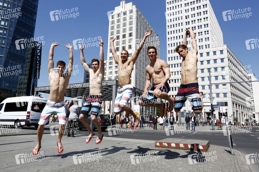 Open Air-Fashionshow des Menswear-Labels Camp David mit Surfern in sexy Beachwear der 'Special Collection Björn Dunkerbeck by Camp David' am Potsdamer Platz. Berlin, 28.04.2014