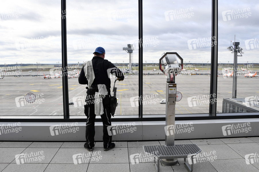 Fensterputzer, Flugplan, Flugpläne, Fluglinie, Flieger, Vielflieger, Urlaub, Flugreise, Abflug, Ankunft, Flugreise, Last Minute, Inlandsflug, Auslandsflug, Flughafen, Flugverkehr, Reisende, Flugreisende, Eröffnung, Flugzeug, Flugzeuge, Airport, Symbolbild, Symbolfoto, Luftverkehr, Luftbrücke, Tower, Logistik, BER, Flughafen Willy Brandt, Terminal, Flugschalter, Luftfahrt, Fliegen, Airways, Airlines