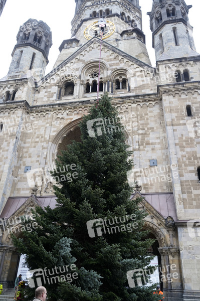 Aufstellung einer 17 Meter hohen Nordmanntanne für den Weihnachtsmarkt auf dem Breitscheidplatz vor der Kaiser-Wilhelm-Gedächtnis-Kirche. Berlin, 02.11.2021
