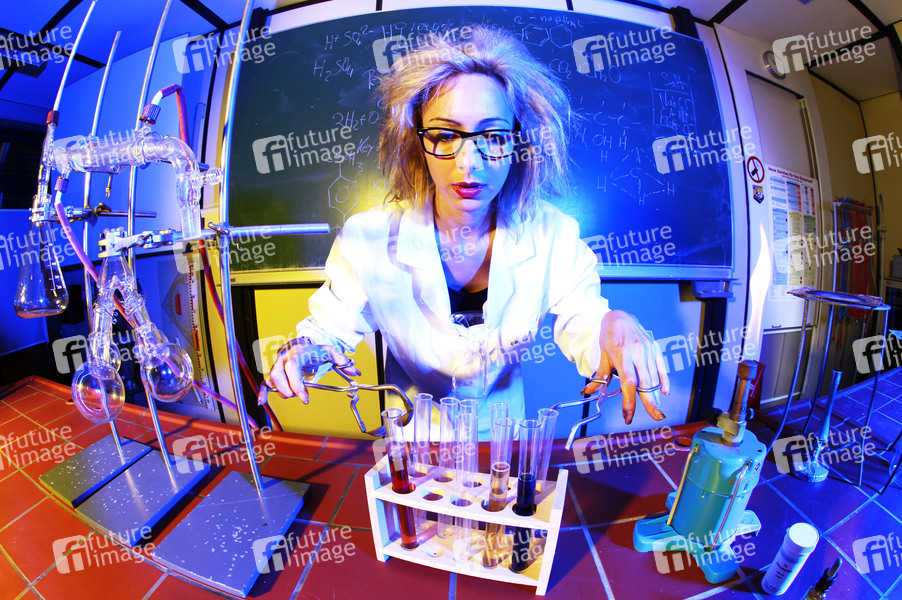 Model-Shooting zum Thema Chemie für das Cover des SOLsnap Magazins im Chemieraum einer Schule. Hameln, 25.05.2013