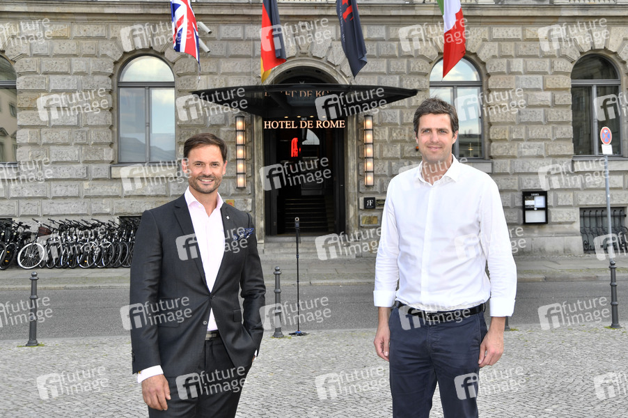 General Manager Gordon Debus und Matthias Schulz bei der Hotel de Rome Wiedereröffnung mit Mitgliedern des Internationalen Opernstudios der Staatsoper Unter den Linden, welche aus den Fenstern des Hotels mit Renato Rascels 'Arrivederci, Roma' und Paul Linckes 'Berliner Luft' den Bebelplatz zum Klingen bringen. Berlin, 17.06.2020