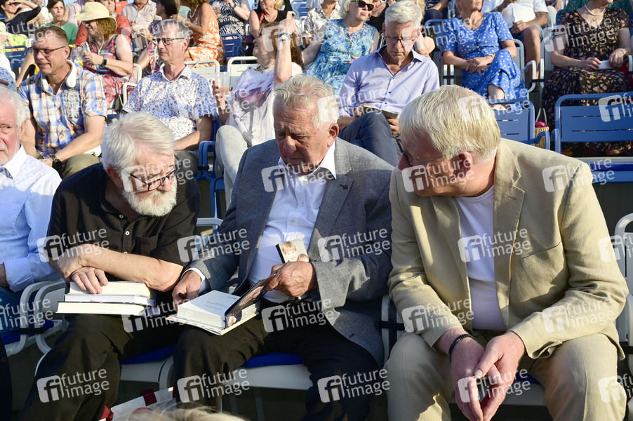Frank Schumann, Egon Krenz und Bernhard Knuth bei der Premiere des Theaterstücks 'Maxe Baumann - Ferien ohne Ende' während der Beelitzer Festspiele 2025 auf der Freilichtbühne. Beelitz, 14.08.2025