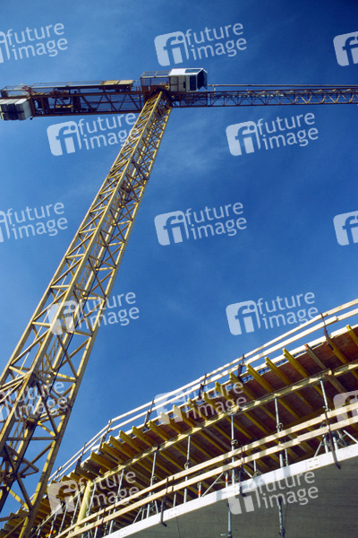 Kran, Krane, Bau, Baustelle, bauen, Hochbau, Tiefbau, ausruesten, einruesten, Arbeit, Arbeitsschutz, Sicherheit, Arbeitsunfall, Arbeitsunfaelle, Konjunktur, Transport, heben, transportieren, Perspektive, Froschperspektive, hoch, Hoehe, arbeiten, Konstruktion, konstruieren, Hausbau, Staedtebau, Umbau, umbauen