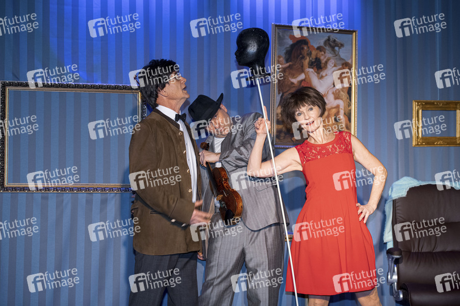 Dirk Neumann, Florian Mayer und Josephine Hoppe in der Theatervorstellung 'Das Ei ist hart! Ein Loriot-Abend' in Hoppes Hoftheater. Dresden, 16.01.2022