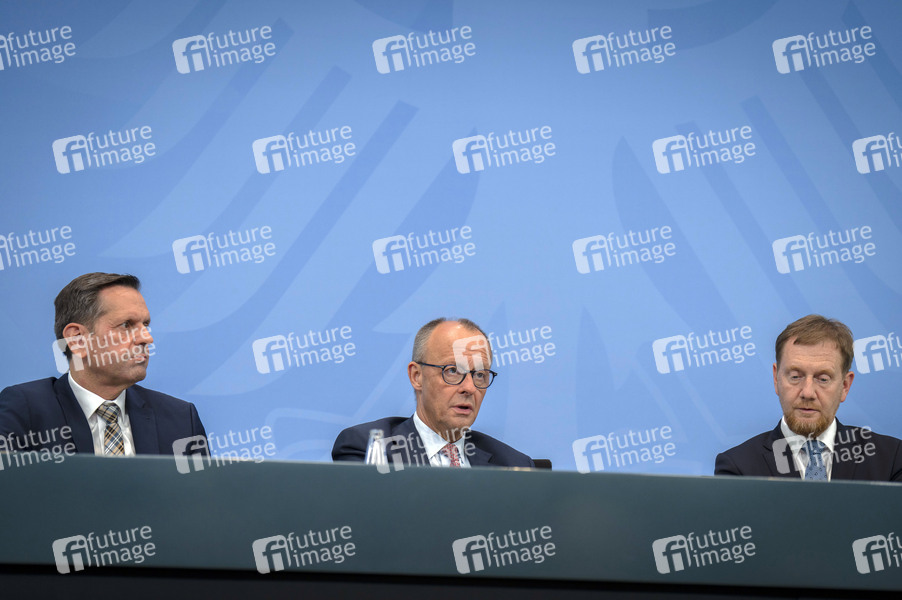 Olaf Lies, Friedrich Merz und Michael Kretschmer bei der Pressekonferenz zur Konferenz der Regierungschefinnen und Regierungschefs der Länder im Bundesratsgebäude. Berlin, 18.06.2025