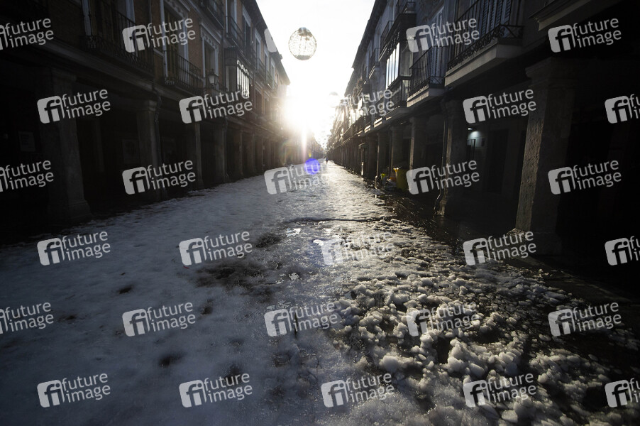 Calle Mayor - Die Region Madrid nach dem Sturmtief Filomena, das in weiten Teilen Spaniens mit starken Schneefällen für Chaos sorgte. Starker Schneefall legte das öffentliche Leben nahezu lahm. Seit 50 Jahren hatte es nicht so geschneit. Alcalá de Henares, 10.01.2021