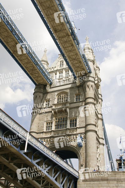 Klappbrücke, Neugotik, 244 Meter lang, Höhe der Brückentürme 65 Meter, die Fahrbahn zwischen den 61 Meter voneinander entfernten Türmen liegt neun Meter über dem Fluss, Fußgängerbrücke in 43 Meter Höhe, die beiden Baskülen können bis zu einem Winkel von 83 Grad hochgeklappt werden, Architekt Horace Jones, erbaut 1886 bis 1894, Themse