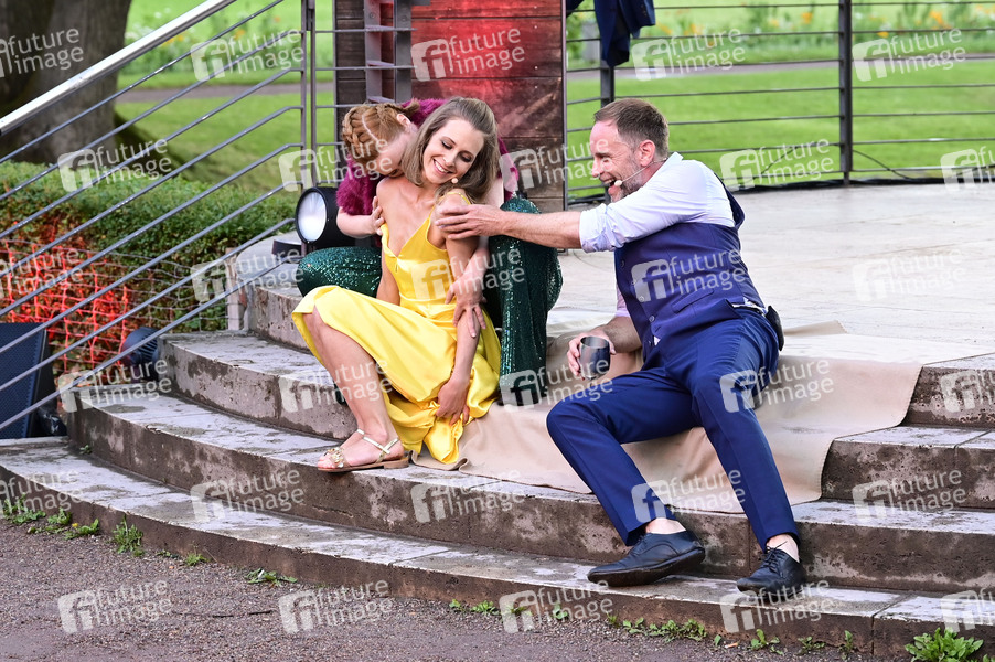 Olivia Marei, Alma Rehberg und Julian Weigend bei der Generalprobe zum Theaterstück 'Jedermann' am Pavillon im Weimarhallenpark. Weimar, 10.07.2024