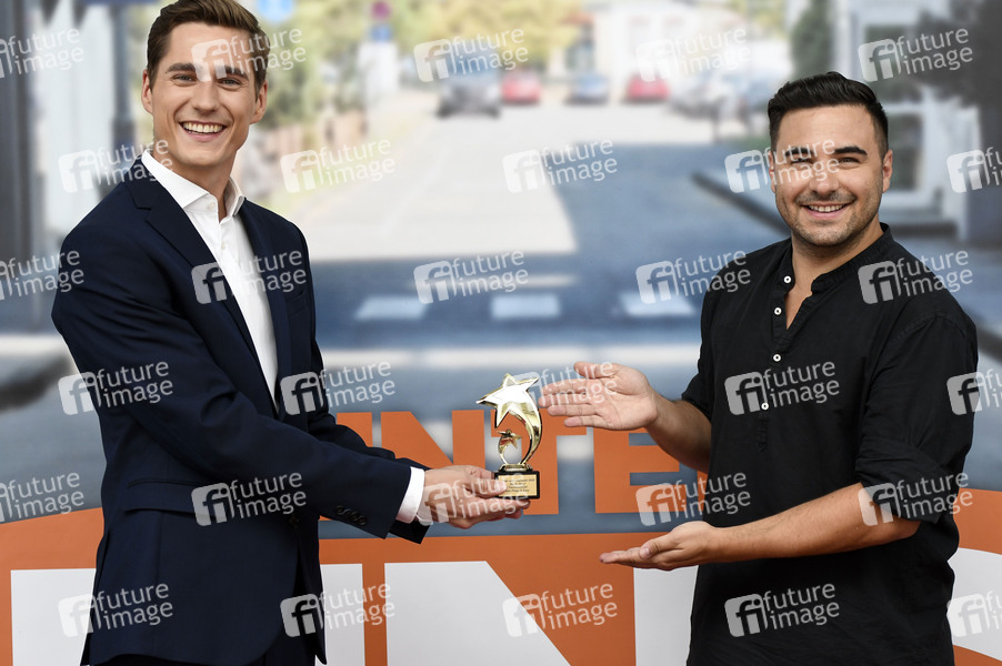 Timothy Boldt und Lars Steinhöfel mit dem Preis für die beste Story bei der Siegerehrung der 'Unter uns'-Starwahl vom offiziellen 'Unter uns'-Fanclub im Coloneum Studio der MMC Studios. Köln, 17.08.2020
