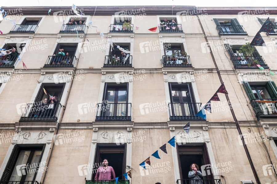 Die Bewohner des angesagten, studentenfreundlichen Viertels Malasana feiern am 47. Tag seit Verhängung des Ausnahmezustands durch die spanische Regierung wegen der Coronakrise. Madrid, 30.04.2020