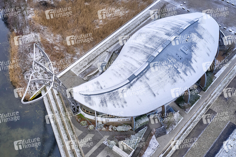 Luftbild vom schneeebedeckten Expowal auf der Chicago Lane im Expo Park. Hannver, 09.01.2021