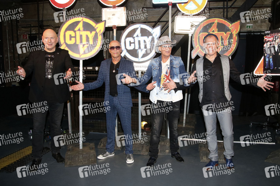 Manfred Hennig, Toni Krahl, Fritz Puppel und Georgi Gogow von City beim Pressetermin anlässlich ihrer Abschiedstour '50 Jahre City - Die letzte Runde' im Kesselhaus der Kulturbrauerei. Berlin, 14.09.2021