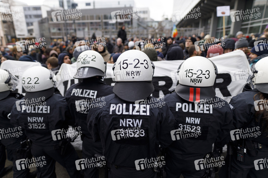 Polizisten schützen Demonstranten gegen den WDR bei den Protesten gegen das von einem Kinderchor gesungene Satire-Lied 'Meine Oma ist ne alte Umweltsau' von WDR2 am WDR Gebäude in der Breite Straße. Köln, 04.01.2020