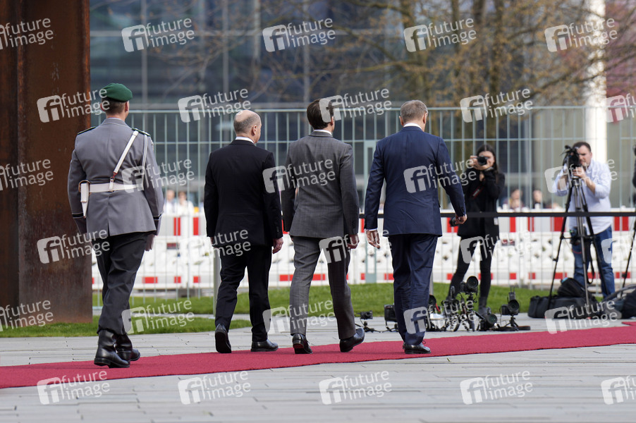 Olaf Scholz, Emmanuel Macron und Donald Tusk beim Empfang des Ministerpräsidenten von Polen und des Staatspräsidenten der Französischen Republik mit militärischen Ehren zu einem gemeinsamen Gespräch mit dem Bundeskanzler im Bundeskanzleramt. Berlin, 15.03.2024