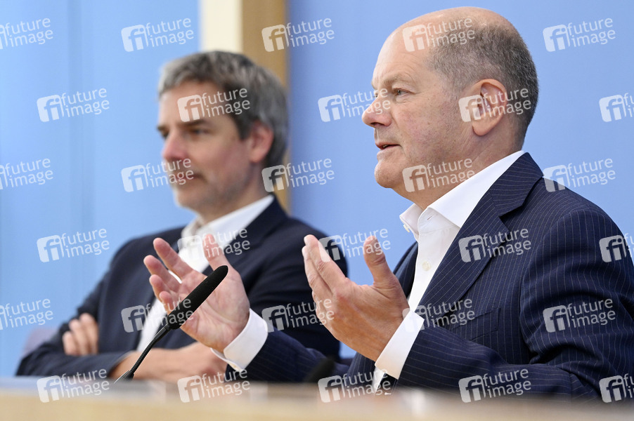 Steffen Hebestreit und Olaf Scholz bei der Bundespressekonferenz Aktuelle Themen der Innen- und Außenpolitik im Haus der Bundespressekonferenz. Berlin, 24.07.2024