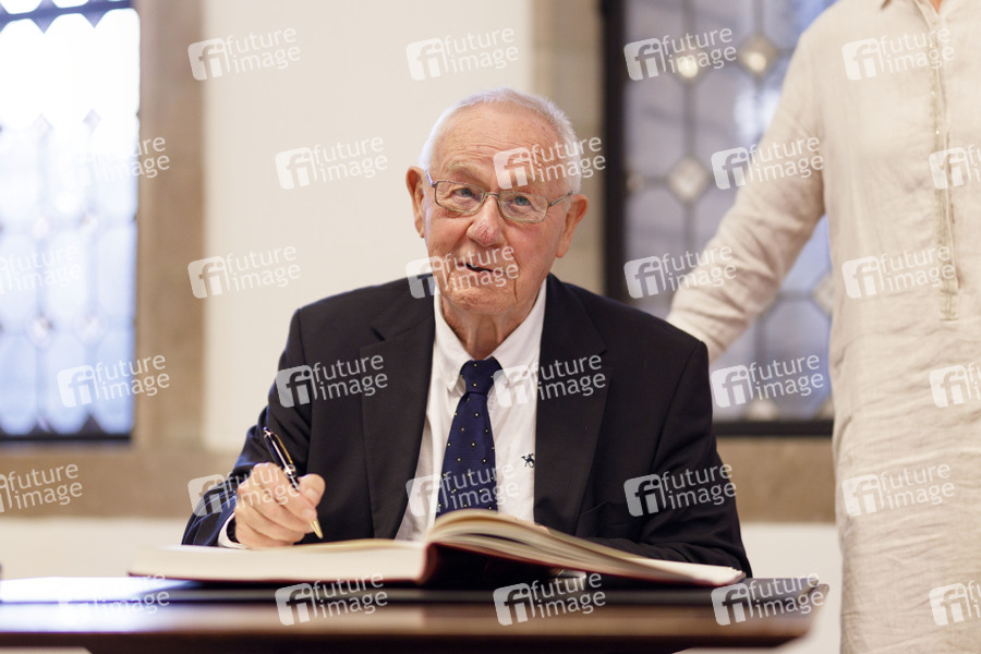 Armin Maiwald beim Eintrag ins Gästebuch - Oberbürgermeisterin Henriette Reker ehrt den Vater der 'Sendung mit der Maus' zu seinem 80. Geburtstag im historischen Rathaus. Köln, 13.08.2020