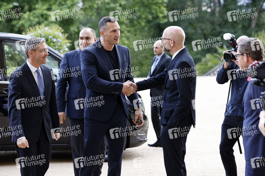 Mike Schubert, Wladimir Klitschko und Moritz van Dülmen bei der Verleihung des M100 Media Award 2022 für das ukrainische Volk in der Orangerie Sanssouci. Potsdam, 15.09.2022
