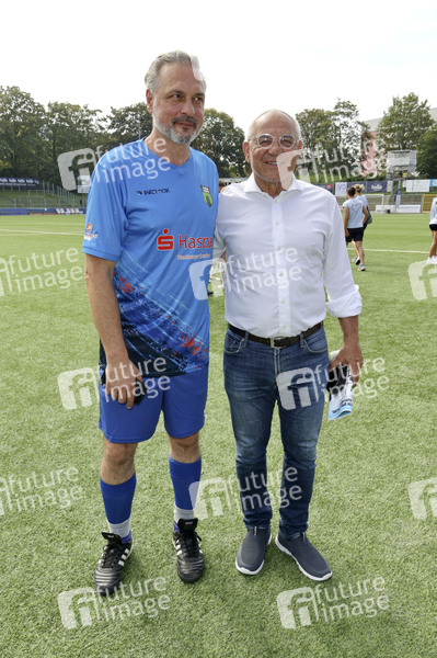 Thomas Mir und Felix Magath beim Benefiz-Fußballspiel 'Kicken mit Herz' 2024 zu Gunsten des Herzzentrums des UKE im Stadion des SC Victoria. Hamburg, 08.09.2024